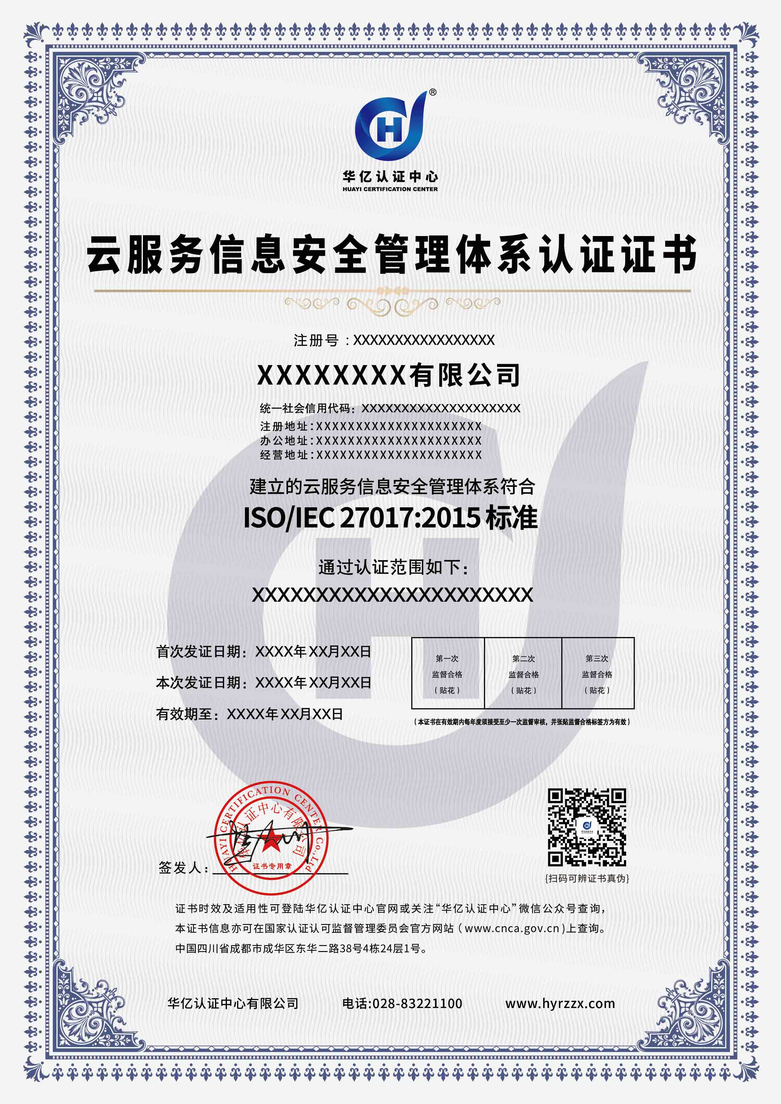 云服务信息安全管理体系认证证书